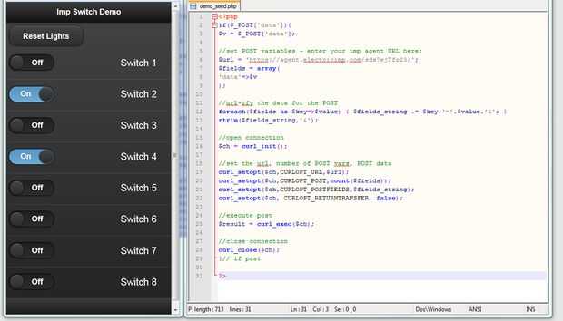 Con mi código Imp, utilizo un sitio web que utiliza JQuery y JQuery Mobile para enviar una pulsación de botón de pulsación momentáneo a la imp. Pulse en, pulse OFF. Usted puede utilizar cualquier tipo de página que desea, y el JavaScript o el HTML5 es lo que quieras que sea. Estoy usando PHP servidor de secuencias de comandos post los valores a la Imp. Usted puede preferir Perl, o algún otro método de servidor.