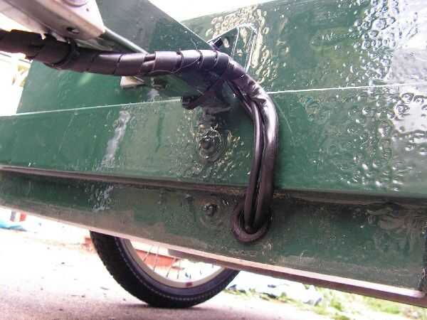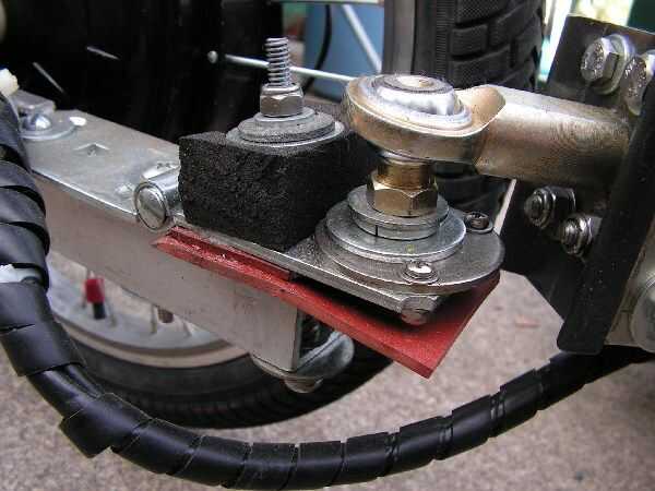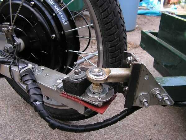 Puedes ver en las fotos que había combinado con un candado grande (parte de la bisagra del sistema de fijación para las vertientes, etc.) y diversos hardware de aluminio y acero. El cerrojo permite subir y bajar la absorción de choque para cuando el trailer golpea golpes; Si no encuentro la descarga de todo lo que peso, como es transmitida a la bicicleta, tiende a debilitar y eventualmente del esquileo tornillos donde se fija la Plaza-acción de aluminio del enganche en el marco de la bicicleta. Utilizar un trozo de espuma gruesa para absorber el choque de este vertical de movimiento - con un ligeramente los ángulos 1/4" perno proporciona un tope superior para el choque. Pedazo de 1/8" espesor silicona junta está situada para que el cerrojo no sonajero cuando esté en la posición relajada.