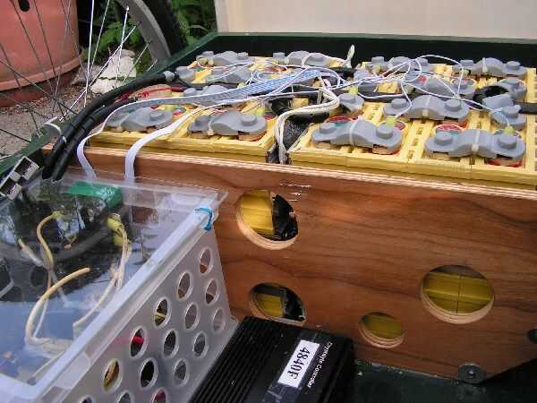 Se trata de una bicicleta eléctrica con 48 voltios, batería de 40amp. La batería es tan grande y pesado, que requiere un remolque separado para llevarlo. La bicicleta no se modificó mucho, por lo que el trailer es el foco de la presentación. Las técnicas utiliza para construir se basan en mis dos otros (marco de madera--) bicicleta remolque instructables. Mi técnica general es construir una base de madera relativamente robusto, aunque pesada y luego construirlo de allí con la más fina madera, aluminio u otros materiales ligeros. En este caso, el trailer es en su mayoría madera, todo y es diseñado para ser lo suficientemente grande para llevar la batería, el controlador del motor y una caja para el cableado asociado, fusibles, interruptores y batería (BMS) del sistema de vigilancia. Las baterías (y cargador) son Thundersky LiFePO4 (China) vendió por Elite Power Solutions: (difícil de encontrar googleando solo) - sobre $1300: