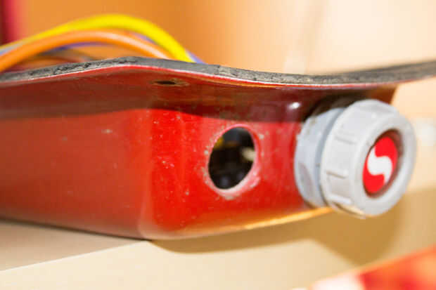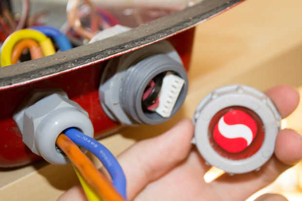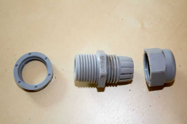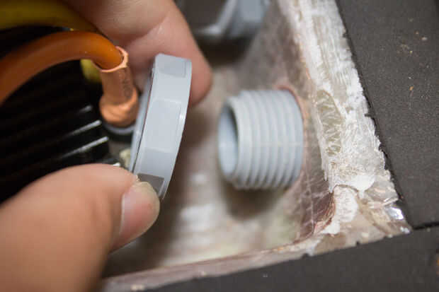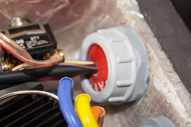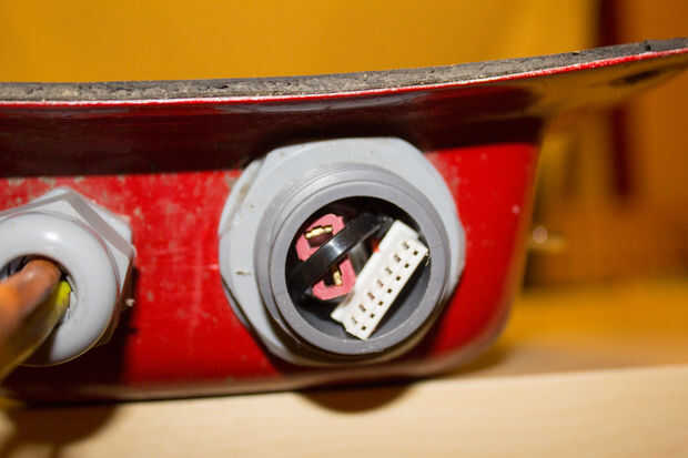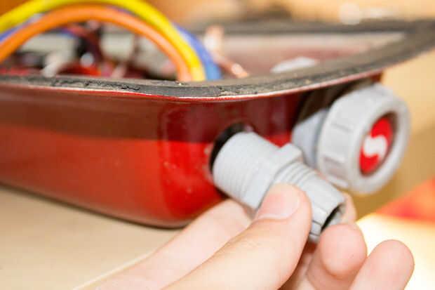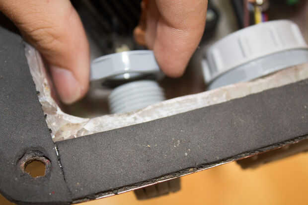 Nuestro caso tenía dos guarniciones del conducto, uno para los cables del motor y otro para los conectores de carga y equilibrio. Acabo de encontrar estas guarniciones del conducto ahí, y sirvieron muy bien para mantener el interior seco. Taladrar dos orificios para las guarniciones del conducto, alimentados con la grifería y me aseguró con las tuercas. Para la guarnición del puerto de cargador, incluso pegué una tarjeta de regalo en la tapa como tapa.