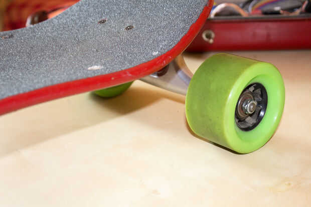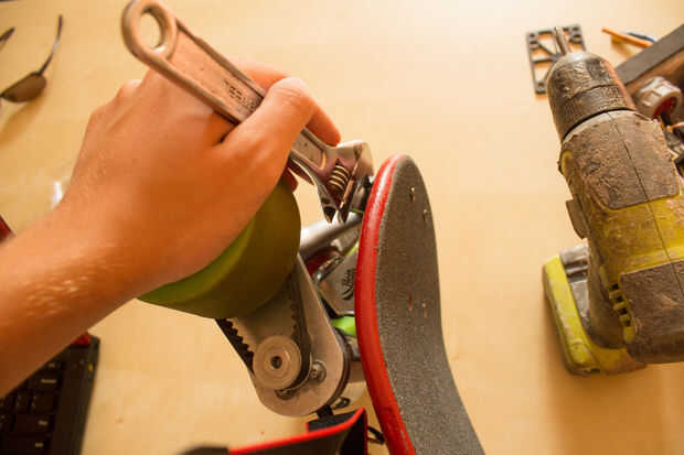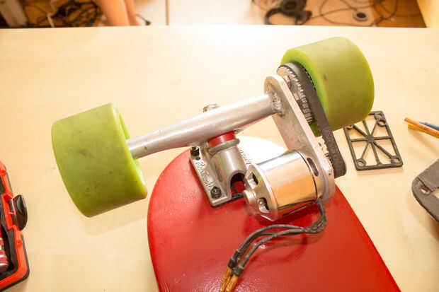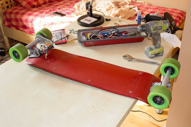 La baraja que elegí es patín donde simplemente taladré agujeros nuevos para el montaje de los camiones. Yo también reforzó la cubierta con fibra de vidrio, que hizo realmente pesado, todavía fuerte. Si vas a hacer este proyecto, elegir una cubierta que es sobre todo plana y tiene un montón de espacio.