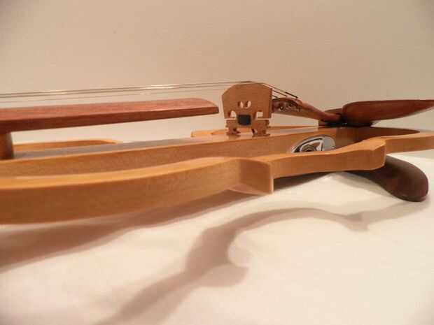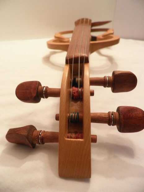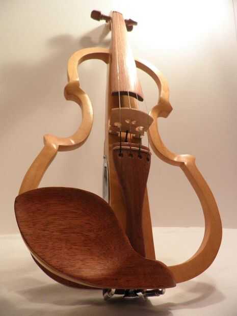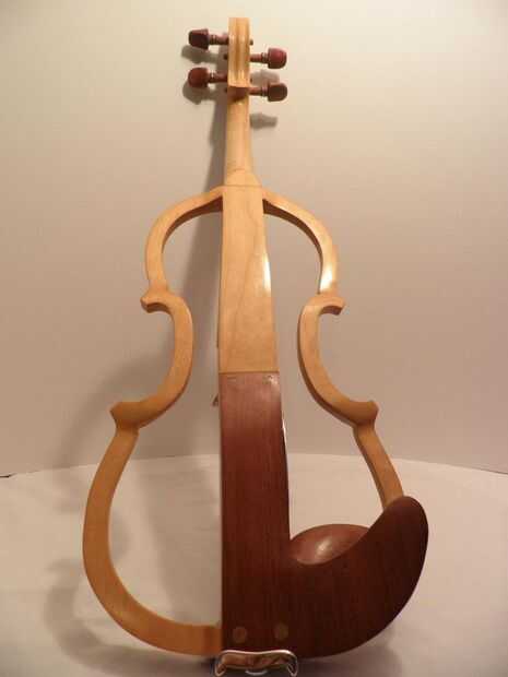 Este esqueleto violín eléctrico usa un pickup piezoeléctrico. El cuerpo y el cuello son el arce sólido y la madera oscura es caoba.