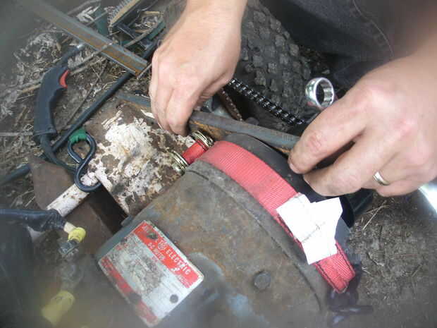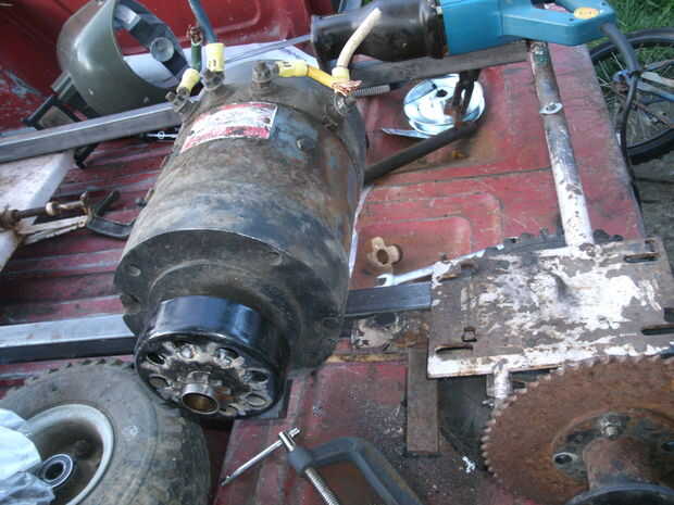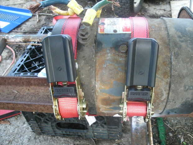 Para fijarlo en su lugar, compraron dos juegos de tirantes y apretados en cada extremo del motor. El motor tenía tanto par, había Ripeado a sí mismo de y se rompió una soldadura en la barra grande, para que fabricar una pieza de metal (al igual que la barra grande) para perno en un agujero en el motor y la soldadura a la estructura junto con las correas. Mantiene en su lugar.