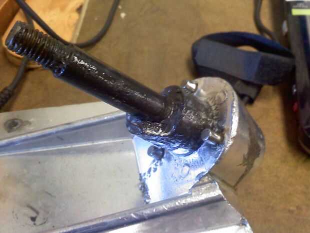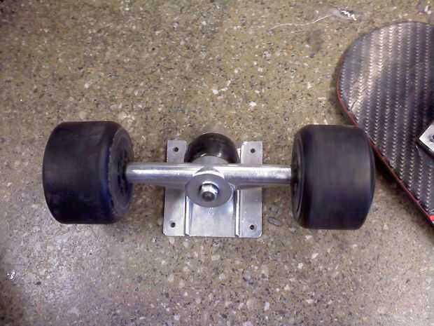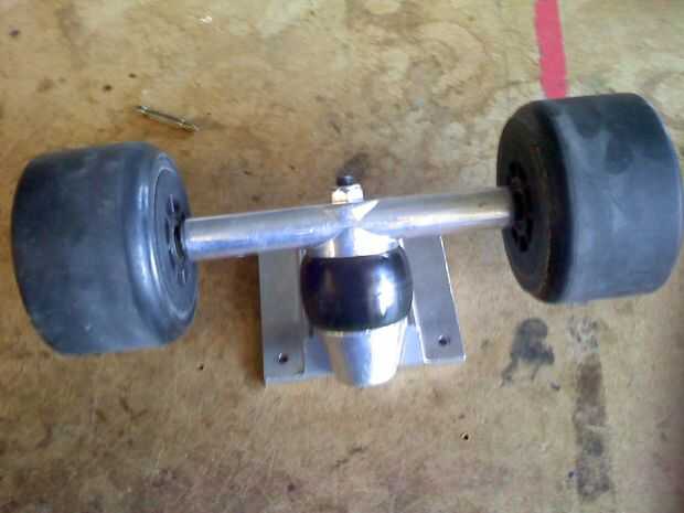 El primer paso fue entender por qué estaba tan mal el radio de giro. Parte del problema era ese motor gigante atado al carro del trasero; su puede en contacto con la cubierta, limitar hasta qué punto podría dar vuelta el carro trasero. Tratando de trasladar el motor grande era inútil, puesto que uno motor grande iba a ser reemplazada por dos más pequeños de todos modos. Sin embargo, no era el problema. Exkate/alterada (misma compañía fyi) camiones son personalizados, ya que tienen una huella única y usan bujes de torsión en lugar de bujes de compresión. Intentan hacer su nuevo tipo de sonido de carro impresionante en su página web, pero el hecho es que no trabajan así como de camiones de compresión normal. El carro delantero en nuestro tablero sólo daría vuelta hasta ahora antes de parar. Así que lo tomó aparte y encontró que estaba parada debido a una característica de diseño del metal irreparables (es complicado, y es la única manera de explicarlo completamente en persona con uno separado). El buje de torsión de caucho es había sostenido por tres pasadores metálicos y demostró cierta tensión grave en esos puntos. En Resumen, no creo que fue un muy buen diseño, y nuestra opinión es respaldada por el mal desempeño de la junta con respecto a la inflexión.