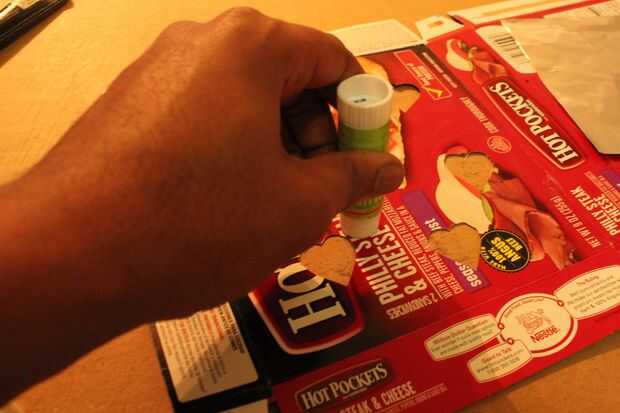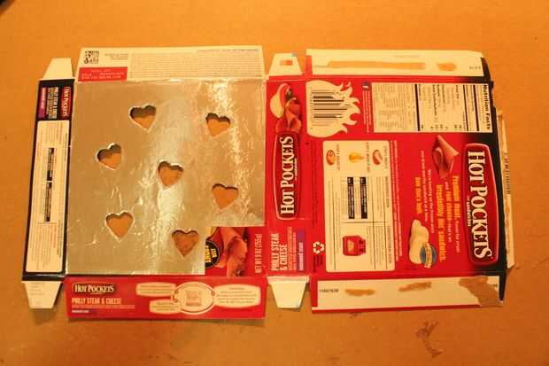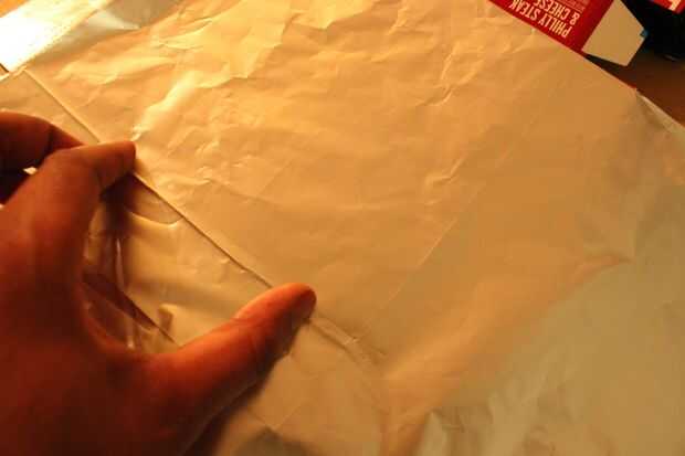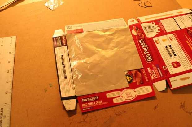 El tamaño de su papel de aluminio contra el tamaño de la caja que está utilizando. Presionar y correr sus dedos a través de la lámina a arrugarse lo. Pliegue el papel alrededor de la cara principal de la caja. Luego se corta. También cortar una esquina de la lámina para algunas de las piezas del circuito para ser colocado. Pegar el papel a la cartulina.