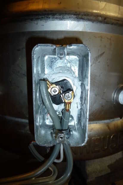 Asegure cada uno de los alambres calientes para el elemento de calefacción. Desea que el suelo para fijarse a la caja tanto práctica y a la caldera del brew sí mismo. Montado el cable de tierra directamente a un tornillo de máquina a través del borde inferior de la caldera y funcionó un corto filamento de alambre de 10G para conectar hasta el punto de montaje dentro de la caja. Compruebe si existe continuidad entre la clavija en el enchufe y el hervidor de agua.