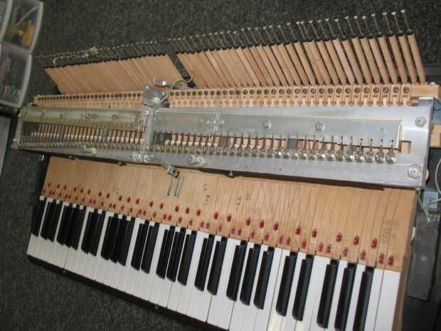 La original Pianos Eléctricos de Wurlitzer de la década de 1960 eran máquinas preciosas con una forma muy interesante de generación de sonido: en lugar de cuerdas, el piano tenía grandes Cañas por martillos (ver imagen). Las cañas producción una señal con un ingenioso principio electrostático: las cañas fueron acusadas hasta cientos de voltios, por lo que formaron un condensador con la placa de tierra adyacentes. Cuando las cañas vibraron, esta capacitancia cambia, empuja electrones para producir mágicamente timbres, zumbidos, crujidos y pitidos etéreos. Si lo piensas, un micrófono de condensador también funciona en mucho la misma manera (excepto con las placas paralelas en lugar de vibrar Cañas). En un sentido, cada caña piano Wurlitzer su propio micrófono de condensador es.