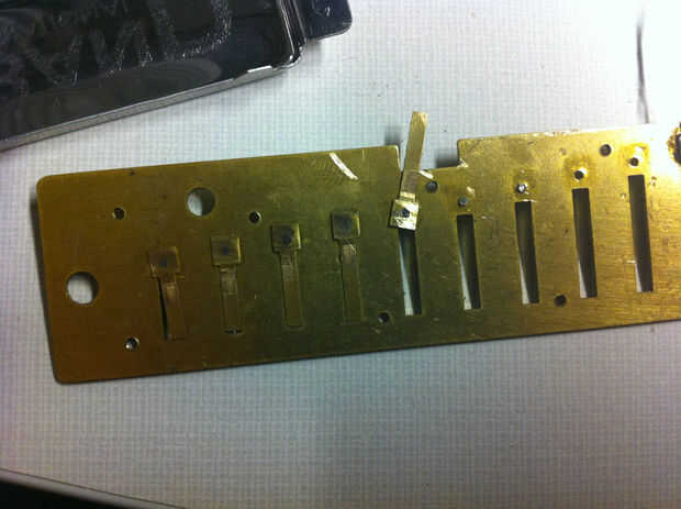 Sin embargo, observe cómo las placas de lámina se diseñan, cada caña se clava en la placa con un pequeño clavo de acero. Esto significa que cada caña es cortocircuito ya eléctricamente a la placa! Es una mala noticia para nuestro diseño. Por lo tanto, tenemos que encontrar una manera de montar las cañas de tal manera que no hagan contacto eléctrico con la placa.