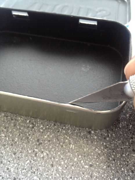 En su estado actual, la capa de goma en la lata Altoids interferirá con el cierre de la lata, posiblemente dando por resultado la ripeo. Para solucionar esto, tenemos que cortar estratégicamente piezas de la capa. Usando un cuchillo X-acto, recorte la capa PlastiDip en la parte superior del borde curvado en la parte inferior de la lata y a lo largo de todo el interior de lados de la parte superior de la lata (la parte que se superpone a la parte inferior cuando la lata está cerrada). Ahora puede volver a la lata y presione las bisagras cerradas otra vez, y listo!