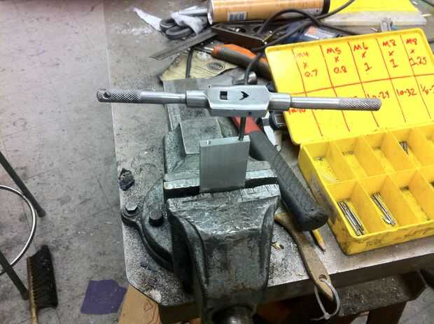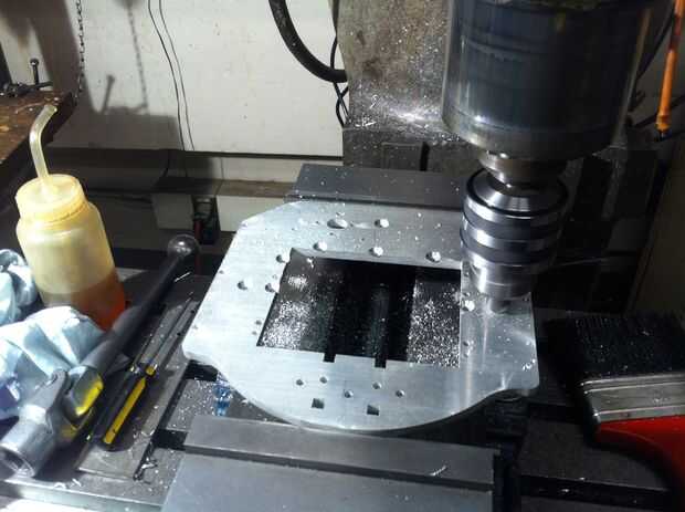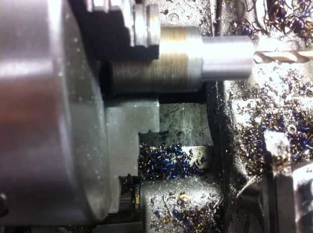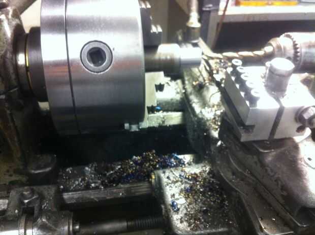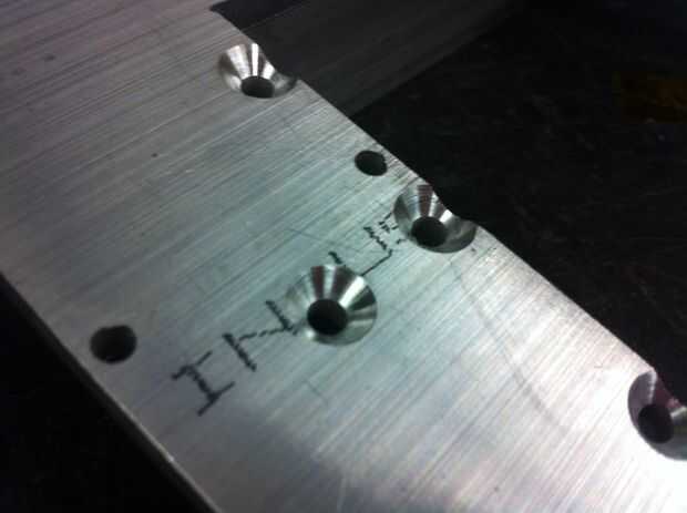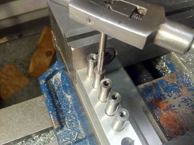 La estructura principal de la estructura se compone de seis varillas de acero con un diámetro exterior de 5/16". Usando un hack Sierra, corté los valores largos en pequeños 1.6" pedazos y luego se convertía en un torno con un agujero de diámetro interno de 0,136". Es difícil conseguir todas las barras de acero a ser exactamente la misma longitud en un torno, ya que no están colocados en la misma ubicación exacta con respecto al torno. Ya que necesito que sean exactamente la misma longitud para la conexión de los dos delanteros y unirlas a las placas, me pegó en un jig de aluminio y ante ellos una fresa a exactamente 1 1/2". Luego había aprovechado los huecos aburridos para un tamaño de tornillo 8-32.