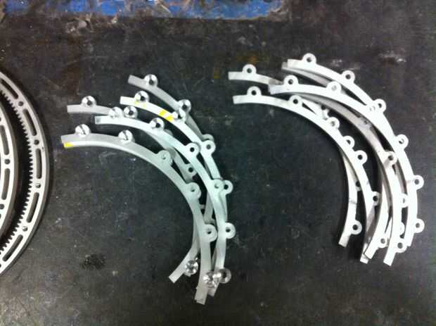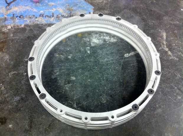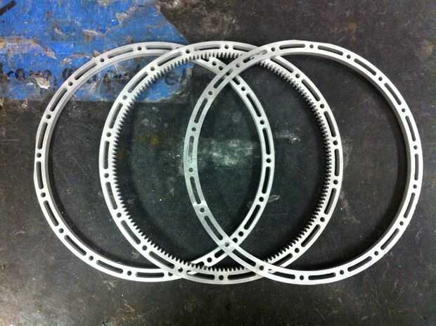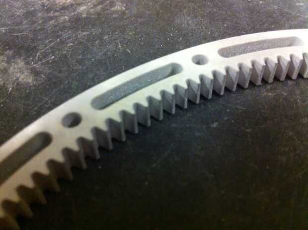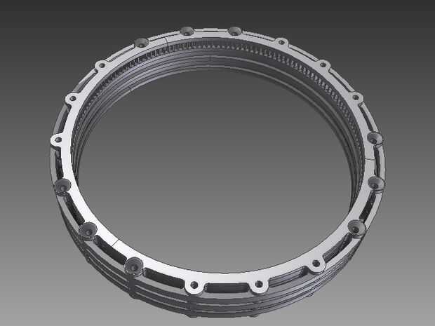 Las pistas de rodamiento contienen agujeros alargados para permitir que el uretano para filtrarse en y dispositivo de seguridad con el borde de aluminio. El diámetro interno es de 7" y el externo es 7,8" a 0,4" por los agujeros y para encajar en la culata de aluminio ancho 8" he comprado de McMaster. Cuando las piezas de borde, sobre todo el engranaje de anillo, de chorro de agua a utiliza calidad 5 así que los dientes de malla correctamente.