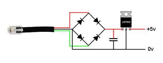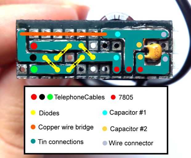 Ahora es el momento para hacer las conexiones y añadir el condensador, si tira el cable del teléfono, verá que contiene cuatro cables, negro, rojo, verde y amarillo. El cable negro es tierra y el rojo y el verde son la fuente de CA, no utilizamos el uno amarillo así que usted puede cortar lejos.