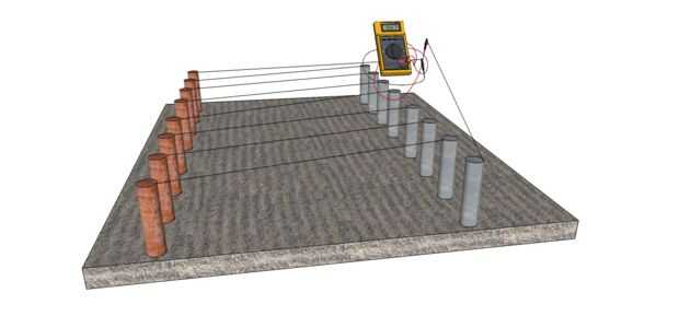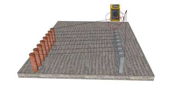 el acero es el centro de la pila nueva. la primera barra de cobre amarillo se empuja el agua tierra empapada hasta que distancia se encuentra que me dio 1, 5V. espaciamiento más grande da un voltaje más alto. el acero están separados por 6 pulgadas y lo mismo para el latón hasta que tienen 8 células. alambre el bronce al acero para que las células están en serie, dando sobre 12v cuando se hace. mi ventilador funcionó un total de 5 minutos. Otra vez sobre 20 segundos recarga tiempo y funcionaron otra vez.