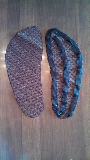 Hice mi propia plantilla de alguna tela de tapicería. Había trazado mi pie sobre el papel, limpiar las líneas de traza, cortar el papel, trazó el contorno de ese documento en alguna tela de tapicería y cortar la tela. Perno de la cinta de carbón a su plantilla y cose en el. Usted querrá usar una máquina de coser para este paso.