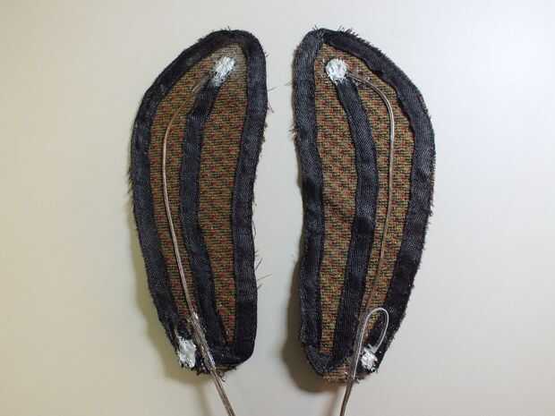 Os adjunto los cables hasta el final de la cinta de carbón por fanning primer y aplanar los extremos pelados del alambre y cosiendo a los extremos de la cinta de carbón. Luego cubrí sobre esas conexiones con este Epoxi conductiva de plata. 2,5 gm fue un montón de puntos de la 4 conexión. Luego añadí algún alivio de tensión adicional en los puntos de conexión y el punto de entrada del cable (en el talón) con algún pegamento de contacto.