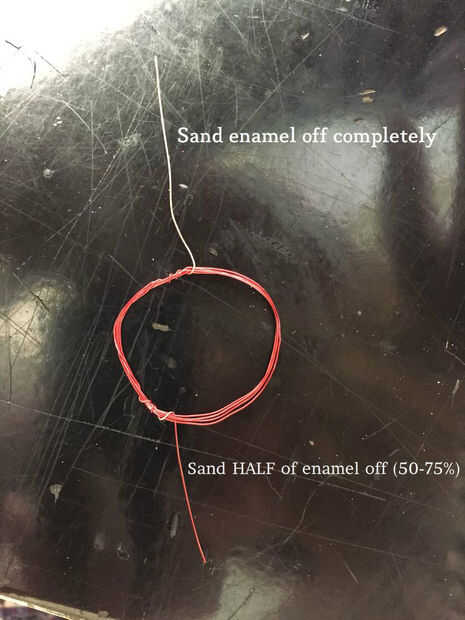 El esmalte en un extremo del cable del imán debe enarenado apagado totalmente con el papel de la arena. El esmalte en el otro extremo del cable del imán debe ser mitad enarenado 50-75%. (Asegúrese de que no se afeite este lado completamente!)
