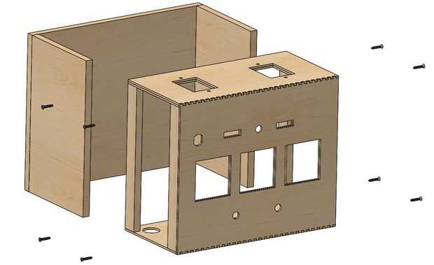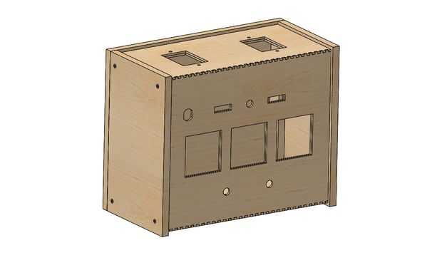 El panel de control en la imagen utiliza el laser-corte 1/8" madera contrachapada como el material de construcción principal. También se cortan los agujeros para los controladores PID, los interruptores, luces, enchufes, receptáculos y otras penetraciones con el láser. Las piezas cortadas por láser comprenden la parte delantera, superior e inferior de la carcasa, con chatarra madera atornillada a una estructura interna que forman los lados y la espalda. Los lados y la espalda son de madera más gruesa y se atornillan juntos que forman una sola pieza en forma de U y el marco con el laser-corte los paneles forman la principal pieza que se desliza hacia los lados y la espalda. Ver el esquematico CAD. Tornillos unir las dos mitades y deje la caja a desmontarse en el caso que otros cambios, reparaciones o trabajos deben realizarse en los componentes electrónicos dentro de.