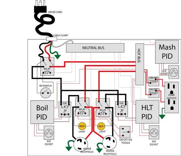 Un montón de cables en el panel de control es resistente para llevar grandes corrientes y así es difícil trabajar con. Cuando se utiliza regletas encontrará que ayuda a los extremos pelados de los cables de la lata. Prensar en terminales de anillo y la espada será necesario recoger una herramienta tan cuando usted compra sus terminales. El adjunto pseudo-esquema te da una idea de lo que quieres hacer. En el esquema, gruesos cables gordos son pesados 10 galga para los calentadores de 30A. El resto se dibujan con líneas finas y puede utilizar alambre más pequeño como calibre 20 o 22 ya que no se llevará a ninguna corriente apreciable. Sin embargo, los cables de la bomba interruptores y enchufes se dibujan en medio porque debe ser calibre 14 ya que las salidas son nominal de 15A y usted puede ser enchufar cosas estas tomas como bombas, ventiladores o la aspiradora ocasional que puede atraer una corriente significativa.
