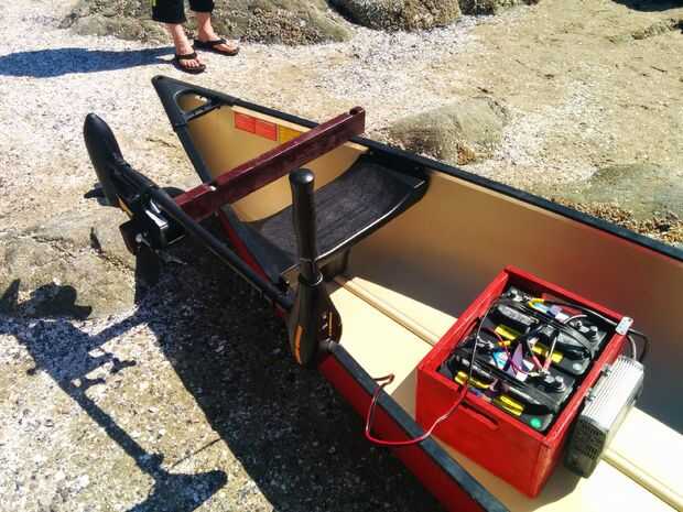 Coloca las pilas bastante atrás y utiliza un montaje de rueda para llegar la canoa desde el coche y en el agua. Las baterías eran bastante pesado, pero incluso con una persona 5 y las baterías, la canoa todavía habría sido bajo de peso.