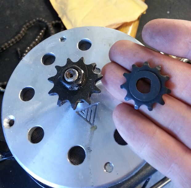 Los piñones era más difícil de lo esperado. La punta del motor no es en forma de "D" pero por el contrario, es aplanado en dos caras. Finalmente fui a una tienda de máquina para conseguir un piñón para perforación y roscado en el cilindro de freno en el que os adjunto el piñón de la rueda (tanto de bicicletas de bolsillo).