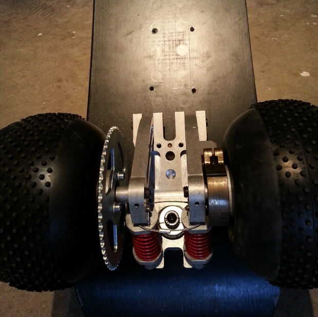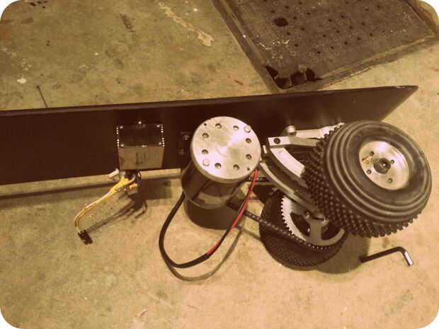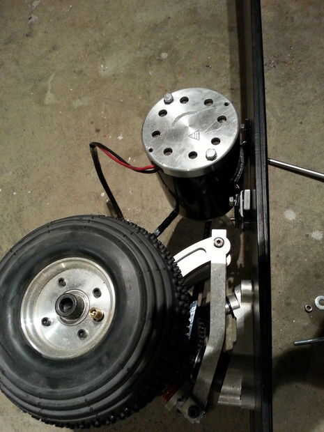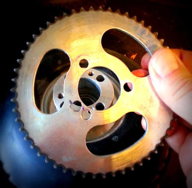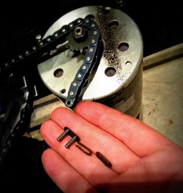 Simplemente perforados a través de la Junta y había empernado el motor en su lugar. La cadena fue acortada por uno de los pernos de acoplamiento pulido apagado y usando un enlace reemplazable. Que terminó acortando por un solo link; mejor acortar que alargar (siempre). Para agregar la tensión un poco jackear a un extremo del motor de la Junta Directiva con algunos espaciadores. La tensión de la cadena fue justo en este punto.