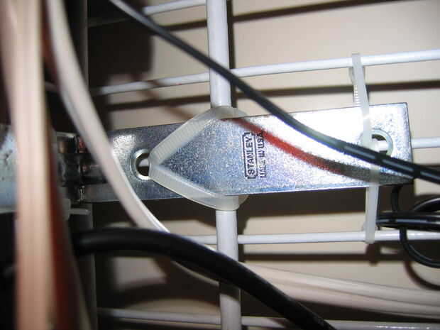 Cubra el estante sobre los soportes y ajustar a la rejilla con ataduras de cremallera como se muestra en la imagen. No tenga miedo de sacarlos muy apretado, que las ataduras de cremallera más grandes son difíciles de romper. Asegúrese de que usted-amarra en ambas direcciones por lo que la plataforma no se moverá de lado a lado o arriba y abajo. Mina siente como su soldado a los soportes. Recorte el exceso. Si se expone la parte posterior de la mesa, usted puede ser consciente de dónde se recortará el empate, estos dejar bordes afilados. Puede que desee asegurarse de que el extremo cortado se enfrenta bajo el escritorio.