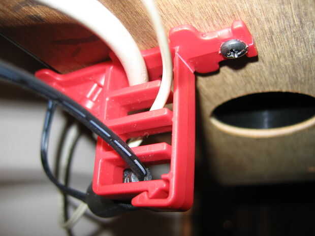 Como se muestra en la foto, retire el clavo de la grapa y utilizar un pequeño tornillo para fijar la grapa en la parte inferior del escritorio. Tantas como necesite, utiliza 5 para mi escritorio ancho 5' - 0". Estas grapas tienen una sorprendente cantidad de cable.