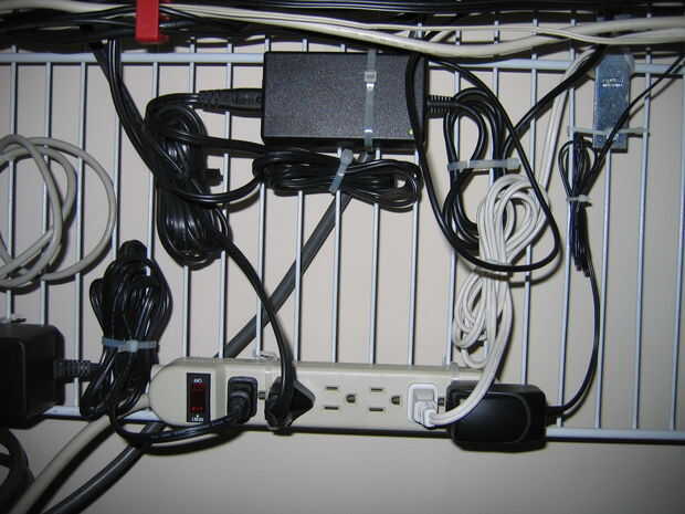 Aras de la simplicidad que decidí correr los cables de alimentación antes de cualquier cable de datos. Como también veremos, he zip-até una 6 enchufes a la plataforma. Mis 10 años Belkin PowerAuthority II que se sienta en mi escritorio es para el equipo protegido. La tira es para los componentes no esenciales como mi cargador de batería AA, cargador del ratón, gateway router cable, altavoces y cosas que quiero "always on". Como se puede ver funcionó el poder, enrollada hacia arriba y zip-atado les en el estante junto a los adaptadores de CA. Me aseguré de no atar demasiado apretado para que yo puedo deslizar hacia arriba y hacia abajo en el cable para cable adicional si es necesario. Sin embargo, hacerlos lo suficientemente apretada para que no deslice hacia abajo. A continuación, ejecute los datos - usb, vga, dvi, etc.... Asegúrese de permitir suficiente holgura en sus líneas para que usted puede sacar el PC sin agotar las cuerdas. Básicamente todo lo que necesitan para estar enchufado fue atado a la rejilla y todo lo que necesita para ejecutar horizontalmente, que pongo en las grapas MultiCable. Como se nota, os adjunto también mi router a la plataforma. Me di cuenta que reinicio lo como una vez cada 6 meses o así y allí no era necesario tenerlo accesible. Sé que puedo tomar una oportunidad dando inicio a la antena de Wi-Fi, pero estoy dispuesto a arriesgarlo.