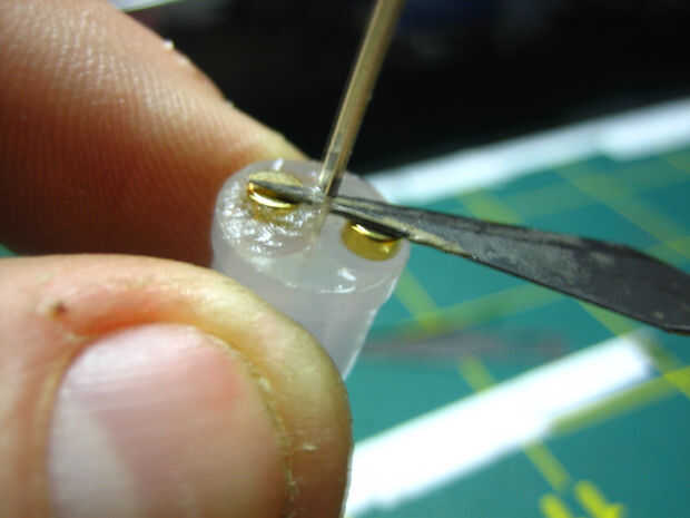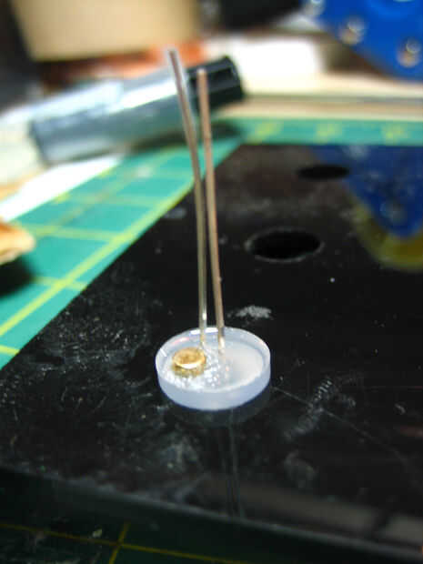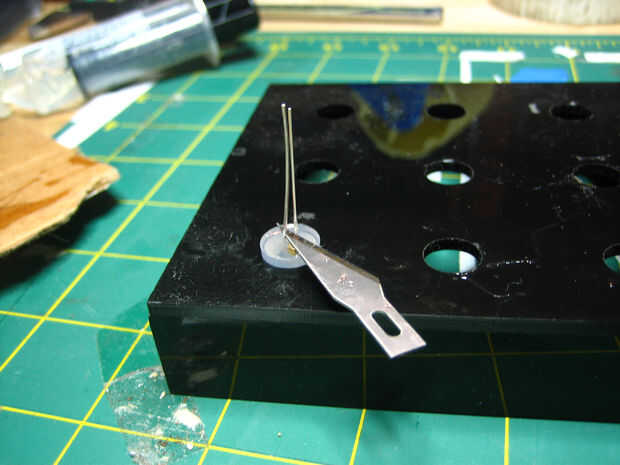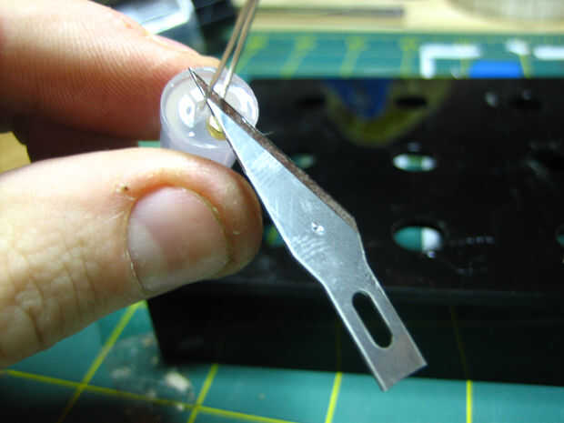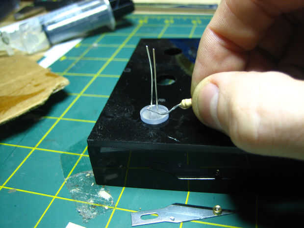 He desarrollado una técnica sencilla para colocar imanes a LEDs usando cuchillos exacto viejo, usado. En primer lugar, creé un soporte de LED en el cortador del laser. También se puede utilizar un pequeño montículo de arcilla, masilla o, supongo, goma de mascar. Mientras sosteniendo el LED con sus puntas hacia arriba, mezcle un pequeño lote de epoxy. Coloque el imán en el extremo de una cuchilla exacto usado, sobre 1/4 de pulgada de la punta (ver foto). Se adhiere magnéticamente. Poner un punto de epoxi sobre el imán y el LED. Ahora, con el imán hacia abajo, deje que la punta de la corredera de la hoja entre los cables del led hasta que el imán establece cara en la parte inferior del LED. Puede ajustar la distancia entre los conductores del LED y el imán moviendo el imán más lejos de la punta de la hoja. EL IMÁN NO DEBE TOCAR LOS CABLES DE LED. Esto crea un cortocircuito ya que el imán es conductora. Una vez que se ha secado se puede repetir el proceso con un segundo imán en el lado opuesto de los cables. El primer imán ayudará a mantener la cuchilla en su lugar para el segundo imán. Confundido?? Sólo revisa las películas y darle una oportunidad.