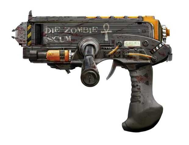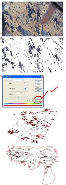 3. desaturación de la fuente, luego fije la capa a "superponer" lo de la pistola sí mismo así que todo está cubierto (en algunas secciones si fuera necesario). Si usted fusionó toda la pistola anteriormente puede varita mágica sólo el contorno y crea una máscara para el grunge. Tenga cuidado, recubrimiento desaparece en blanco, por lo que si se añade un fondo más adelante se mostrará. Asegúrese de que usted la máscara toda la pistola bien.