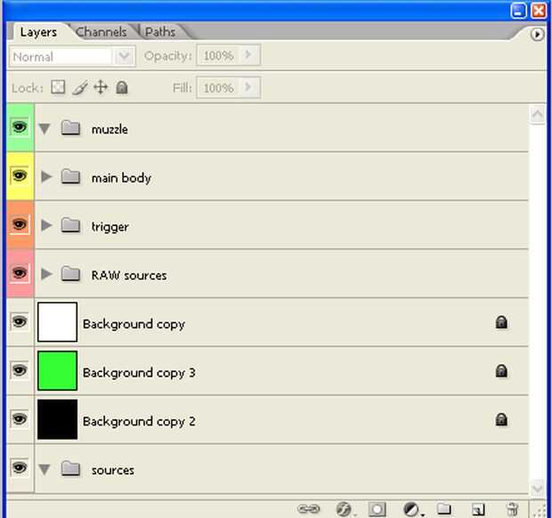 Imagen 2: Las capas del panel cómo comencé después tenía el gatillo, cuerpo principal y bozal carpetas maltratados modo pude organizar todas las imágenes que estaban relacionados con.