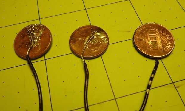 Cada centavo a una longitud de alambre de la soldadura de un metro o más FIG 3. Uno de estos conductores hacen único de alguna manera (es decir, utilizar un hilo de color diferente o anote la fecha en el centavo). Más adelante tienes que ser capaz de identificar fácilmente este cable como su tierra. Los otros dos cables no necesitan ser distintos. Usé algunos soldadura soldadura de Radio Shack para sujetar el cable a los centavos. Frote un poco en la interfaz entre cada centavo y sus hijos y mantener a fuego hasta que adhiere a ambas superficies. El resultado no es bonito pero solo le ahorró alrededor de $10.