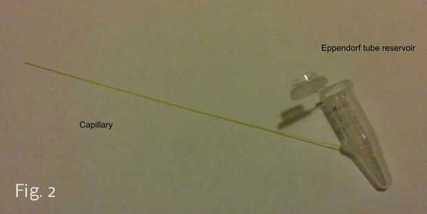 Hice un agujero con la aguja de la jeringuilla en el lado del tubo de eppendorf, pasa un extremo del tubo capilar y lo empujó hacia el fondo del tubo. A continuación, puse silicona alrededor del agujero (interior y exterior) para tapar el agujero y esperar overnght para que se cure completamente. Será este tubo eppendorf - depósito del electrodo (ánodo) (Fig. 2). La + tubo de eppendorf de depósito catódico no se modifica.
