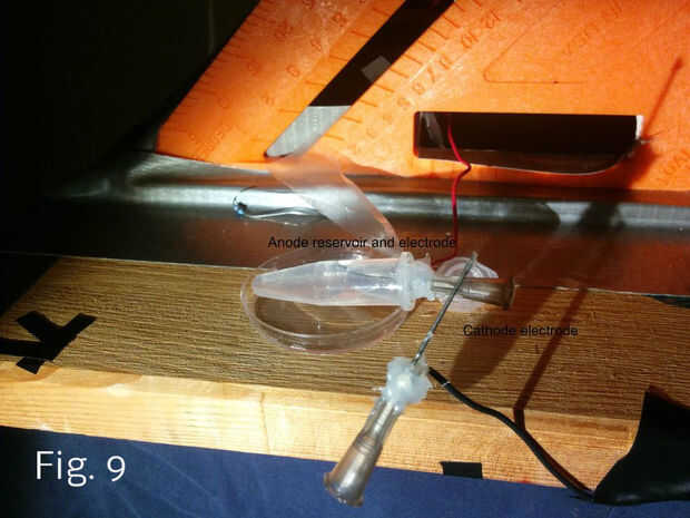 Por lo general personas usan alambre de platino para electrodos en los embalses. La razón de esto es estabilidad química (no desea que su electrodo para cambiar la composición o "fuga" en embalses. He usado agujas de jeringuillas que tenía alrededor. Ellos están hechos de acero inoxidable y no he notado ninguna degradación durante el uso. Soldar el cable de conexión que conduce de + y - los cables de la fuente de alto voltaje para agujas. También he utilizado silicona (uno que se utiliza para calafatear) para cerrar el agujero de la aguja de la jeringa y cubrir la parte soldada. La única parte que está en contacto con el líquido es Corcel inoxidable aguja fuera de la superficie.