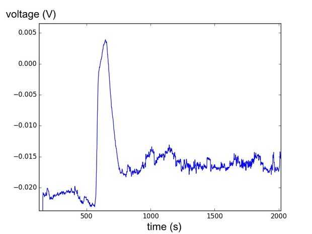 Es necesario confirmar que tubo capilar está abierta y sistema de detección funciona como se supone. Por lo general inyectar solución salina y pasar por el tubo capilar hidrodinámico. Se debe ver un pico de registrados voltaje vs tiempo trama. En este caso, ningún búfer está en los depósitos, sólo agua destilada, y muestra inyectado es 150 mM de NaCl.