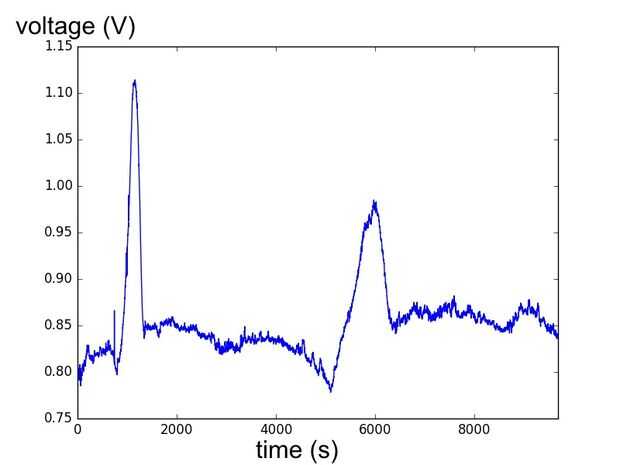 En una foto puedes ver qué tipo de resultados se puede obtener en estos experimentos (éste se realiza con un voltaje alto voltaje menor que en la configuración actual pero el tipo de trama es la misma). La muestra fue orina en tampón de citrato salino de sodio - SSC. Lo que estamos evaluando es: Cuántos picos podemos ver y su intensidad (máxima tensión). El CE tiene serios inconvenientes que no da información de lo que es el tipo de molécula/ion da el pico. Para esto normalmente pharma utiliza espectrometría de masas (darle el peso molecular de la molécula) después de la CE u otras técnicas de separación molecular. Creo que el mejor uso de la CE monitoreo es decir, si haces rutinariamente las medidas de lo mismo (digamos orina o saliva) y buscar picos anormales. Otra sería evaluación de la longitud del ADN cuando se puede hacer comparación de escalera del ADN. Por desgracia, uno necesita un buffer a un pH adecuado cuando quieres buena separación y también grandes polímeros que actúan como un colador cuando haces separación de ADN. Me encantaría ver el protocolo que se puede utilizar sólo electrónica sin productos químicos consumibles. Si tienes una idea o un libro sobre esto, por favor hágamelo saber.