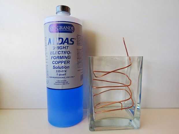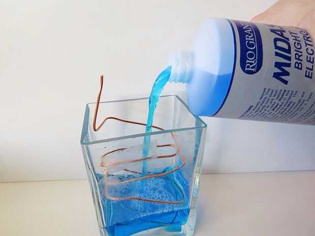 Doblar la bobina de cobre para caber en el contenedor galvánico. Asegúrese de que usted ha expuesto un poco de la parte superior para conectar la pinza de cocodrilo en. Vierta en la solución y asegúrese de que esté lo suficientemente alto como para sumergir completamente sus pendientes.