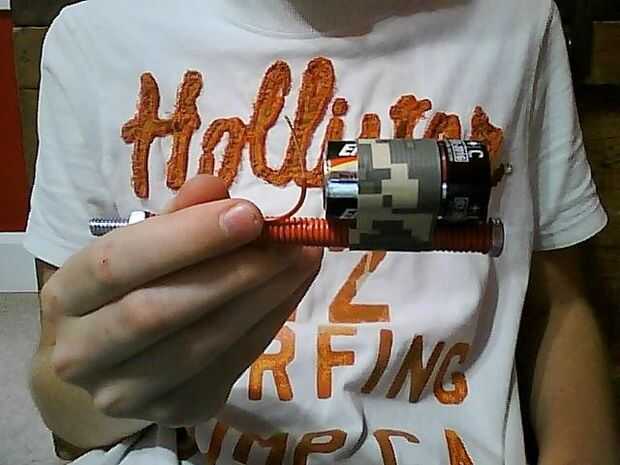 Bueno ahora su pronto a ser electroimán debe ser algo así. Ahora para agregar la fuente de energía. en mi caso, una batería de C. Su cinta y que la batería entre los dos extremos del cable de cinta. Tienen el extremo positivo de la longitud más corta de la cinta el alambre al contacto y cable que se está pegando para arriba. No de la cinta el otro extremo del cable al negativo.