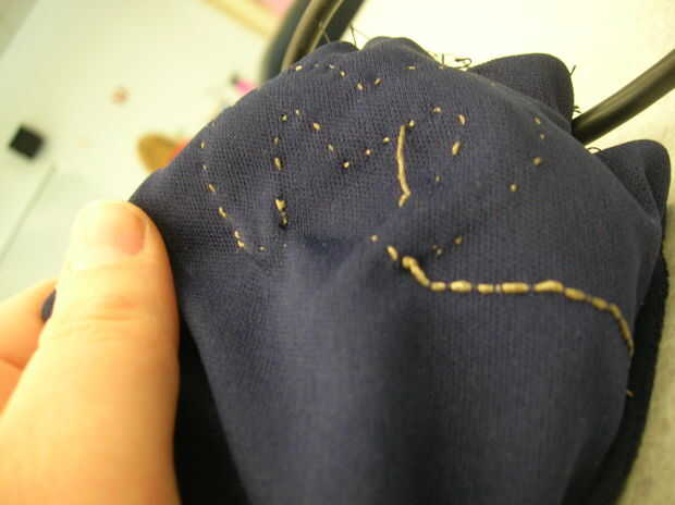 Una vez que el logo es cosido, gire el guante de revés y continuar cosiendo en el interior del guante (ver segunda foto). Si recoges a un par de hilos con cada puntada, debe ser capaz de coser el hilo conductor a lo largo para que sea invisible cuando el guante está dado vuelta derecha hacia fuera otra vez. Coser todo lo alrededor de la parte posterior de la mano por lo que puede traer el hilo hacia arriba a través de al Lilypad más adelante.