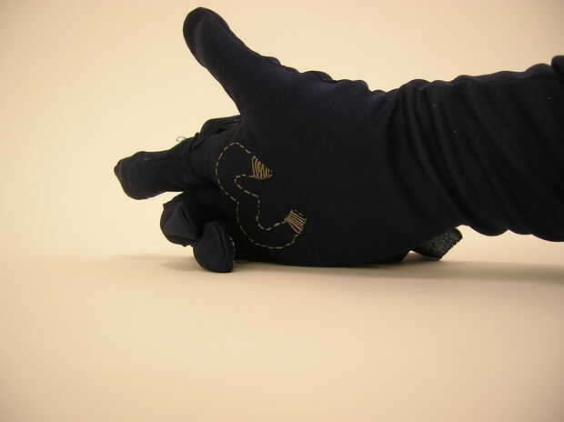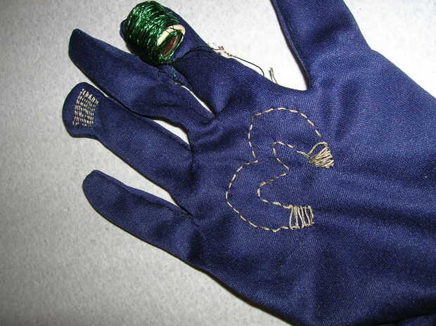 Hilo conductor es más gruesa que el hilo normal, lo que lo convierte en un hilo de bordado fino. Cortar una plantilla de papel en forma de logo de doble imán de MagnetoGirl, clavado en la palma del guante y cosida alrededor de él. Tenga cuidado de no coser el guante juntos!