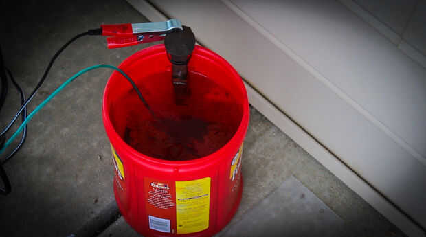 Por razones de seguridad, hacia la configuración de un área ventilada. Encienda el cargador y esperar. Si está trabajando, usted comenzará a ver burbujas saliendo de la pieza de trabajo. Corrí la prueba durante 24 horas y la mayoría del moho se había ido. Lo dejé por otras 24 horas y la pieza de trabajo se volvió totalmente negro. La espiga electrodo tenía una capa gruesa de 1/8" de moho alrededor de él como se esperaba. Tenga en cuenta la oxidación en la en la parte superior de agua. También hubo una buena cantidad en el fondo del recipiente.