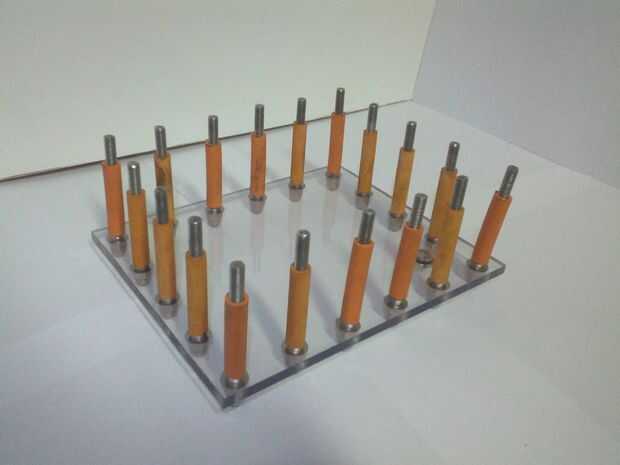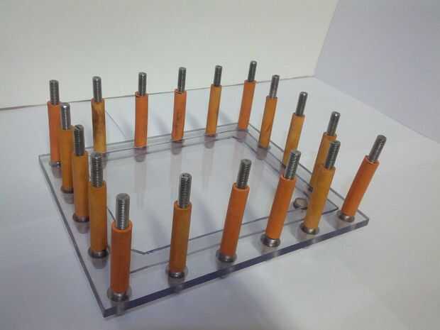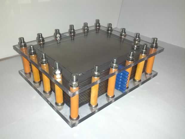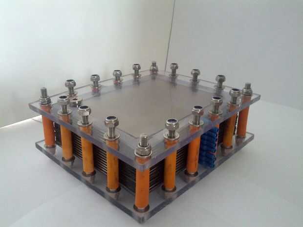 Necesitará cortar 18 longitudes de 100mm de tachonar de M8 y archivo de los extremos para una tuerca muy sencilla de instalar, en un extremo de cada uno de los 18 bits de entramado poner una tuerca de la bóveda y una arandela y luego alimentarlos a través de los 18 hoyos en una de las paredes laterales. A continuación corte el tubo de goma en 18 tramos de 57mm y ponerlos sobre los pasadores como aislamiento. A continuación poner una de las juntas entre los tornillos y el tubo de goma y luego poner una placa A una junta, una placa de B, una junta, una placa de A... en la parte superior hasta que se han utilizado las 16 juntas, patés de A 8 y 7 placas B garantizar que el 10 mm agujeros de línea con 1/4 de agujero BSP en las paredes laterales. Una vez que todas las placas y las juntas en poner el segundo extremo de la pared en la parte superior y vuelva a colocar las arandelas en los pasadores y la nilocks en apretando las esquinas primero y luego los demás.