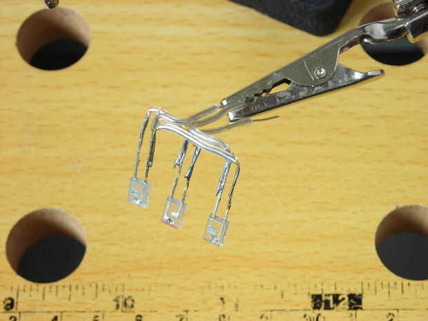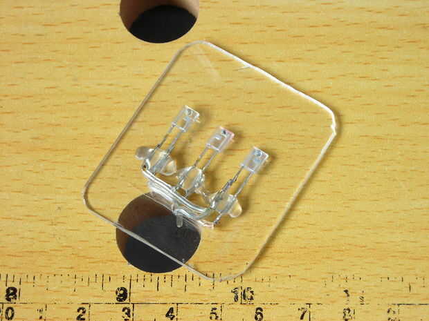 A continuación cortar una pieza de plexiglás para caber dentro de la parte inferior de la caja del anillo, pero lo del labio inferior sostiene lo. El siguiente paso es poner los emisores de IR y sensor de plexiglás como se ve en las fotos usando pegamento caliente entonces colocar y etiquetar los cables.