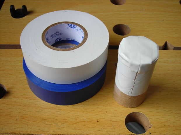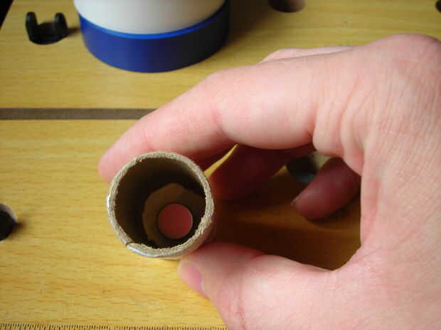 El objeto que se muestra a continuación es un pesado tubo de cartón cubierto de cinta aislante con 2 1/2" diámetro x 1/4" espesor metal imanes de tierras raras (de Digi-Key). He flotado con éxito un troquel que ganchillo usando un cuadrado de la abuelita y un rubí de papel de construcción.