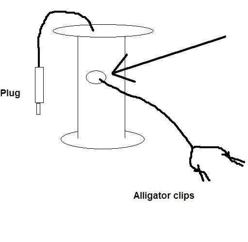 2. Si desea mantener el alambre en el carrete, desentrañar todo, tira de una pulgada de dos cables en cada extremo, sobre un pie de alambre por el orificio del carrete de alimentación (como se muestra en el diagrama) y el orificio en la parte superior. Luego Envuelva la parte larga del alambre alrededor de la bobina y attatch el enchufe y los cocodrilos (el conector va en el pedazo largo de pie saliendo de la parte superior de la bobina y el cocodrilo clips van en el extremo del cable envuelve la bobina)