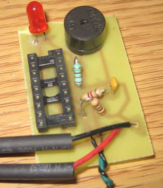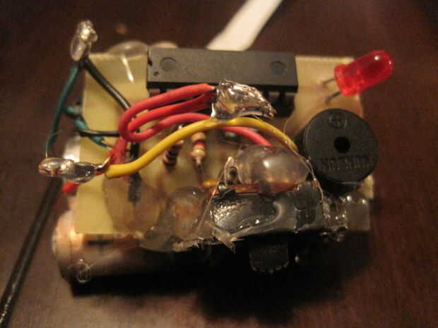 Pasados son los días de inspeccionar un pañal para determinar si es ese momento o no. Sabes lo que estoy hablando. Introducción de la electrónica del pañal: una prenda interior de alta tecnología para los niños con un sensor que monitorea el nivel de comodidad del niño. Proporciona retroalimentación instantánea audible a través de un zumbador y un sistema de notificación sensorial óptica persistente a través de un LED. En teoría, funciona haciendo uso de un divisor de voltaje que es extremadamente sensible a la humedad en la punta de la sonda. Cuando está mojado, la electricidad pasa a través de los cables de la sonda, pero con cierta resistencia. La caída de voltaje se mide a través de convertidor analógico a digital del microcontrolador cada segundo. Tan pronto como se detecta cualquier voltaje, un timbre se apaga como una sirena seguida por pitidos a intervalos 5 segundo para siempre y cuando se detecta humedad. El LED se enciende y se queda luz indefinidamente, sin embargo, en la aparición de humedad. Así que después de un cambio de pañal, se requiere un reinicio.