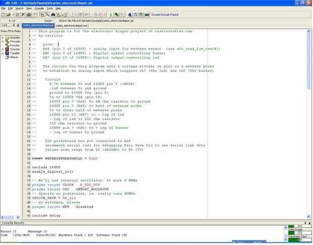 Para programar el microcontrolador PIC, descargar el archivo hexadecimal electronicdiaper.hex y grabarlo en un PIC 16F88 con un quemador como el programador U2 de PIC.  Si desea desarrollar el software, descargar la electronicdiaper.jal de código de fuente y uso el compilador JAL y bibliotecas para compilar.  Utilice un tablero de dev con un potenciómetro conectado al pin RA4/AN4 el 16F88 y un resistor del LED/220 Ohm al pin B7.  Zumbador debe ser conectado al pin B0.  Pines RB2 (TX) y el RB5 (RX) se utilizan para comunicaciones en serie a un ordenador para la depuración.  La Junta Directiva de experimentador de laboratorio-X18 y melabs U2 programador fue utilizado para desarrollar y depurar el software.