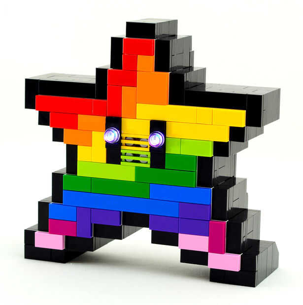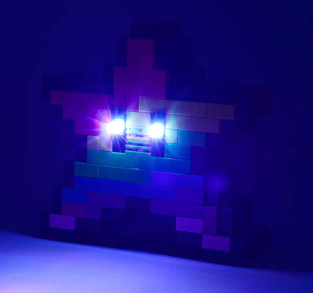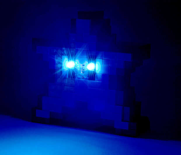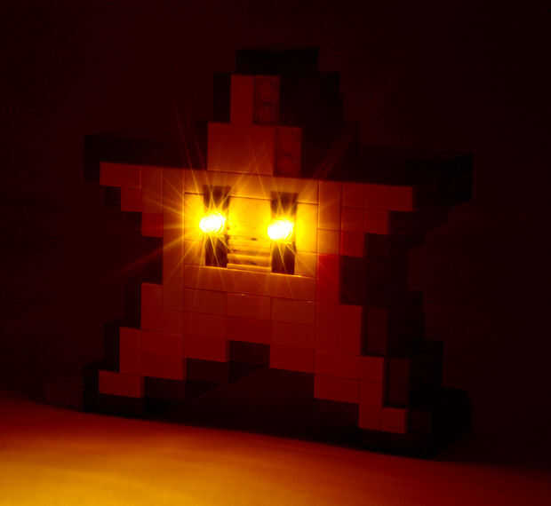 Este es un divertido y único proyecto que inicialmente empecé edificio poco después del lanzamiento de mi Electrónica LEGO Star Wars DL-44 Blaster pistola --que significa este proyecto en particular fue construido utilizando mis conocimientos adquiridos de la pistola, así como utiliza una funcionalidad muy similar. La mayor parte del proyecto es una versión en miniatura 3D pixelado de una icónica estrella de invencibilidad (o Starman) de la serie Super Mario Bros. , pero dentro es un tablero de circuitos miniatura que contiene unos componentes para hacer los ojos parpadear y reproducir música. Como mi DL-44 Blaster, este proyecto también requiere de un Arduino, así como conocimientos de cómo programa microcontroladores. La parte electrónica que esto es mucho, mucho más fácil y ágil versus el DL-44 Blaster, como el microcontrolador utilizado es un ATtiny85 melodías de tono, en lugar de un ATmega328 todo para archivos de sonido PWM de voladura. Cuando todo haya terminado, al pulsar un pequeño botón táctil situado en la parte posterior de la cabeza de Starman, los juegos de música Mario invencibilidad durante unos segundos (a través de tonos, no WAVs ni MP3s), mientras que un abrir y cerrar dos ojos en la sincronización.