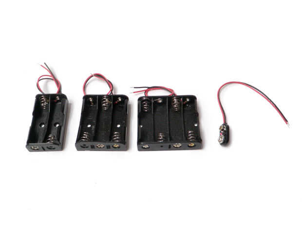 Para comenzar con, necesitaremos clips y portapilas. La batería estándar que vamos a trabajar con es AA y los titulares de la batería de tamaño estándar tendrá dos, tres y cuatro pilas AA.