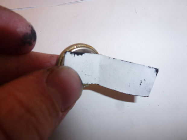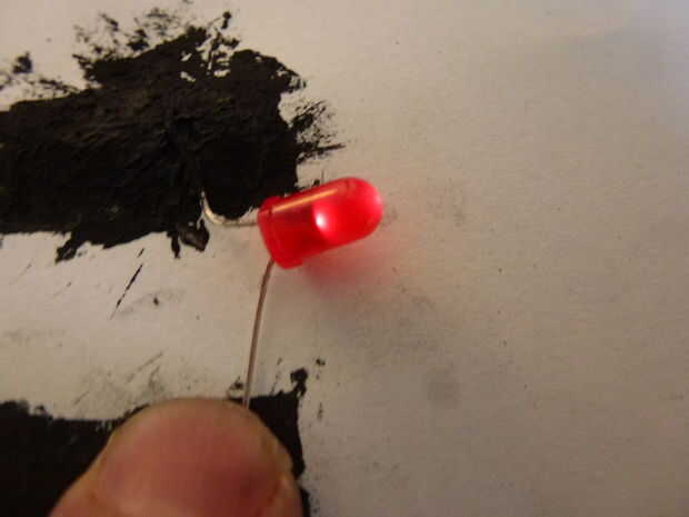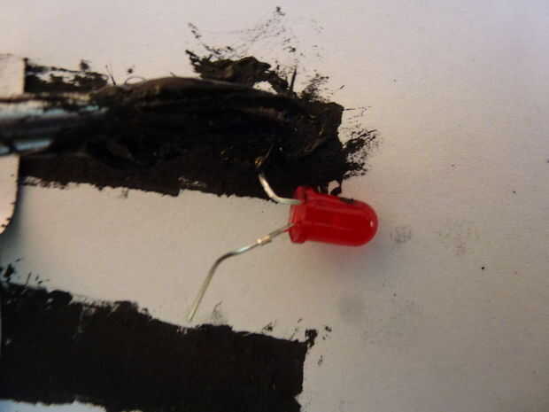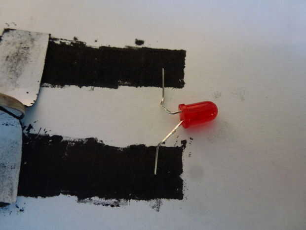 Instrucciones: En primer lugar, pintar o estampar dos líneas paralelas separada aproximadamente 1/2 de pulgada en un pedazo de papel. Coloque un pedazo de 1 pulgada de cinta conductora a ambos lados de la batería de botón de 3 v. Centro de la batería en su borde y presiona la cinta en las líneas correspondientes. Asegúrese de que la cinta y la pintura están haciendo buen contacto. Utilice pegamento conductivo para conectar uno de conduce los LEDs al otro extremo de una de las líneas pintadas, observando la polaridad correcta. Recuerde que el lado aplanado del led es el cable negativo . Doble el cable de enfrente del led para que no esté tocando la línea paralela. Permitir que el circuito que se seque. Por último, para activar el circuito, presione la punta doblada en la línea de pintado. Esto cerrará el circuito y el led debe encender.